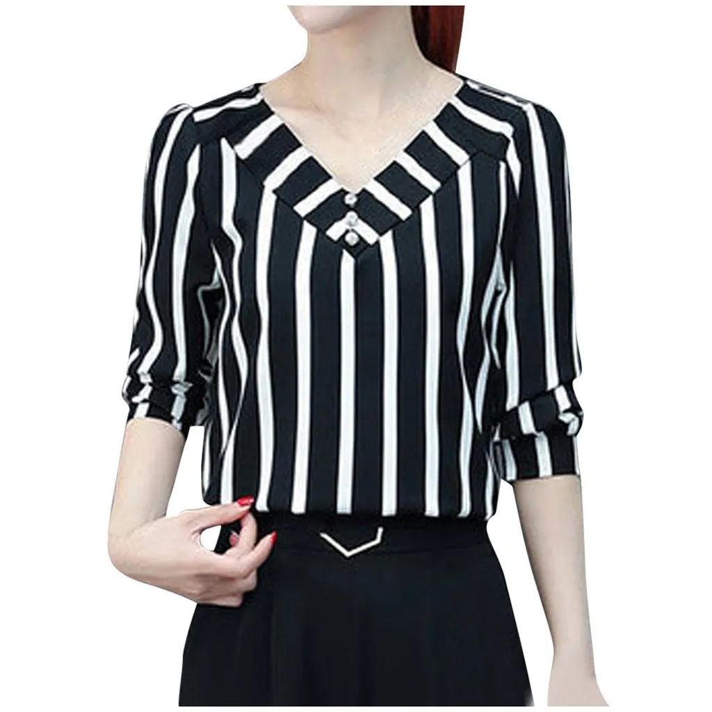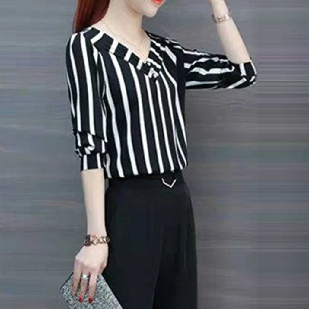 Business Tops Shirts Women Fashion Leisure Three Quarter Sleeve V Neck Blouse Stripe Print Women's Lace Slimming T Shirts