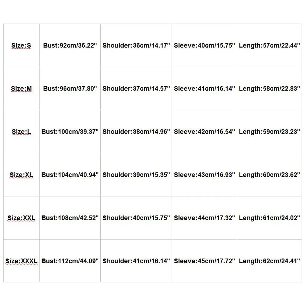 | Size:XXL | Bust:108cm/42.52'' | Shoulder:40cm/15.75'' | Sleeve:44cm/17.32'' | Length:61cm/24.02'' |
